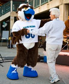President M. Therese Antone, RSM, dances with Salve Regina’s Seahawk mascot during the university’s 60th anniversary concert and fireworks display